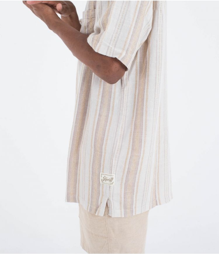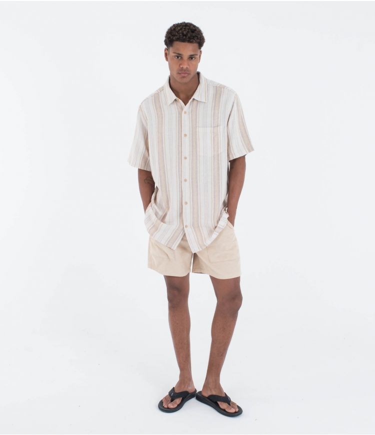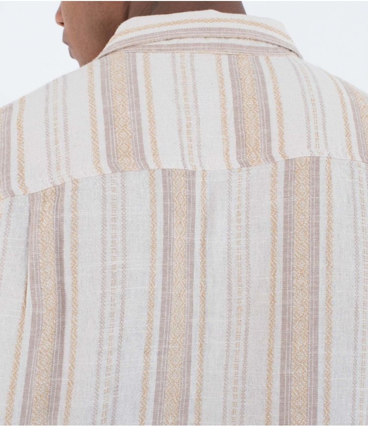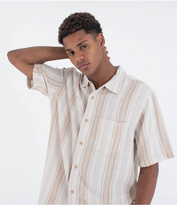 La camisa de manga corta para hombre Oceanside combina un estilo fresco y relajado con una confección natural y cómoda. Hecha de una mezcla ligera de lino y rayón, con botones de madera que refuerzan su aspecto auténtico, presenta un elegante estampado de rayas que aporta un aire desenfadado pero sofisticado. El bolsillo parche en el pecho, los pliegues en la parte trasera y el dobladillo recto con aberturas laterales garantizan un ajuste fluido y cómodo. Con un discreto parche de lona en la parte inferior izquierda, esta camisa es la elección perfecta para un look versátil y natural en los días cálidos.